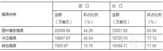 1. 按塑膠模具種類分,塑料橡膠模具進出口額占比為44.26%和65.88%;沖壓模具為40.04%和17.12%,如表所示。