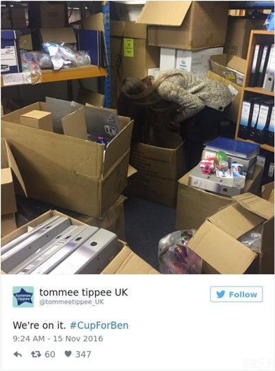 這場愛心接力很快引起了水杯生產商Tommee Tippee的注意。Tommee Tippee在推特上回應說:“我們已經組織了一隊人幫忙尋找本的同款杯子。”瞬間感覺找到了一個和泰能特模具一樣有愛心的企業,員工在倉庫尋找杯子,一番波折后,工作人員終于在中國的工廠里找到了生產這款杯子的模具!這款杯子是20年前的產品,但為了本,他們決定給他單獨生產500個杯子。Tommee Tippee表示:“這些杯子足夠本用一輩子,家人不用再擔心找不到杯子了?!?br />