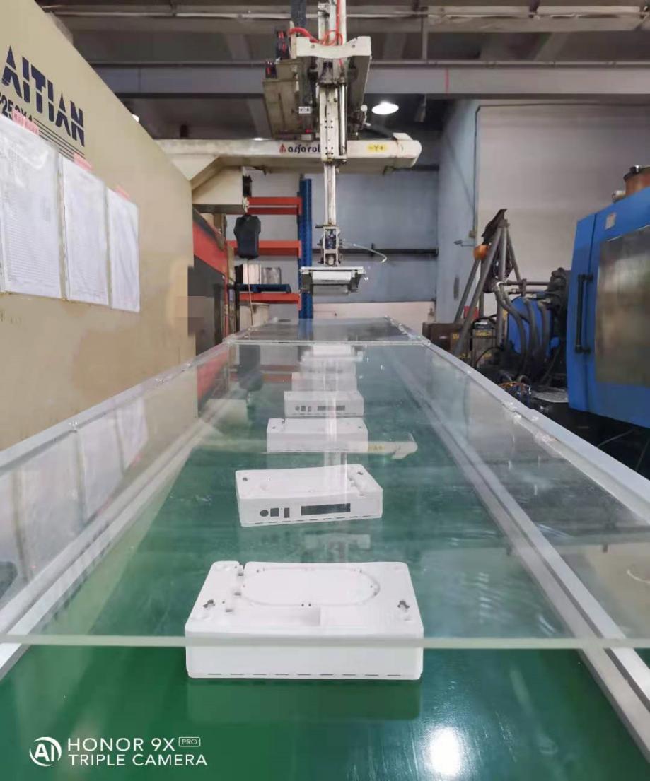 下蓋產(chǎn)品四周批鋒去除,不需要修件,2個產(chǎn)品通過設(shè)計合理的機械手治具,在生產(chǎn)中可以用機械手治具直接將產(chǎn)品抱住取下,成型周期控制到39秒以內(nèi);